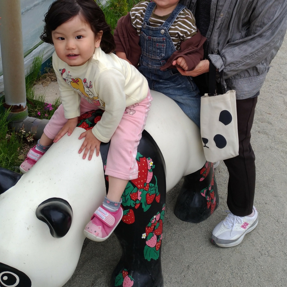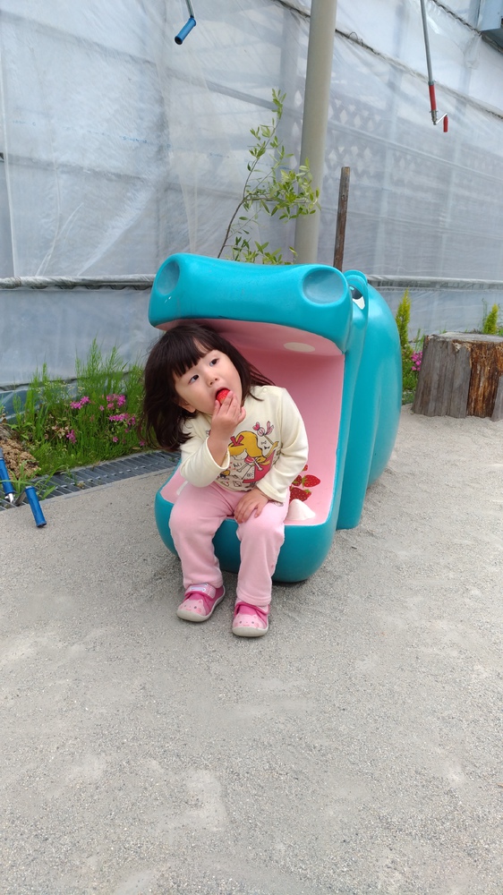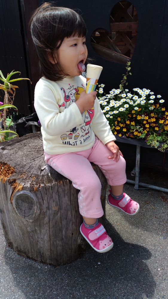 アイス食べて鹿に座り、なかなか苺食べてくれなかったなっちゃん。