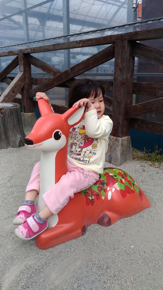 受付開始してから、今度は入ってすぐにあった鹿の置物?みたいなのに座りこみ、苺狩り全く興味なし(苦笑)