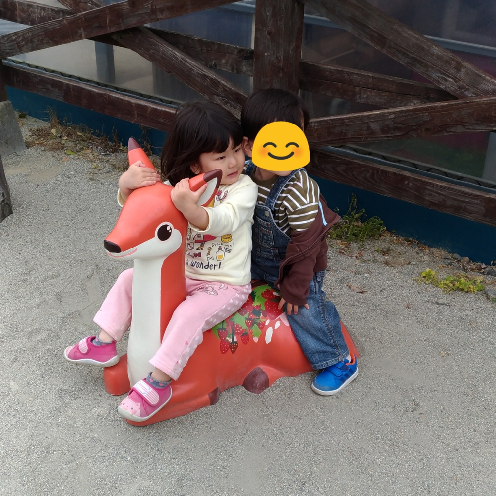 食べてから、また外にある鹿に座り、友達の息子くんと一緒に仲良く座り可愛い〜(*^^*)