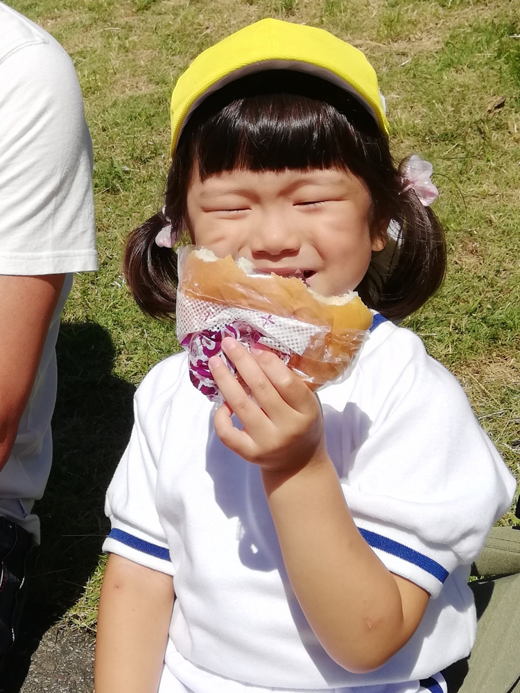 保護者のパン食い競争で、ママがGETしたアンパンを美味しそうに食べるなっちゃんでした(笑)