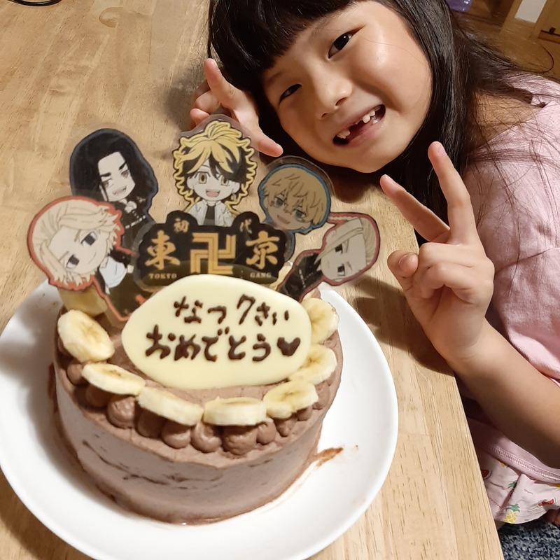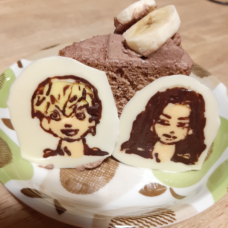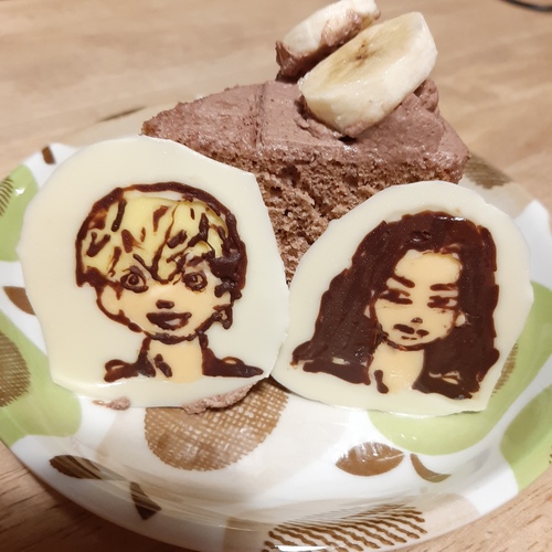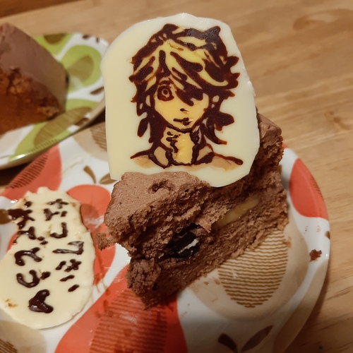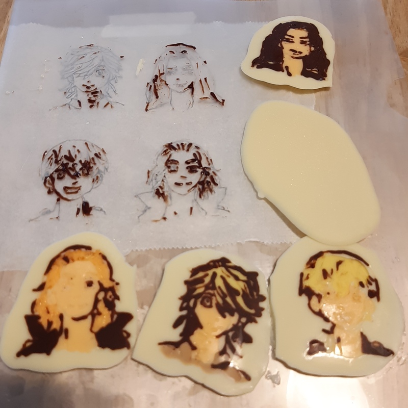 手描きチョコ大失敗だったので、失敗した場合用に準備しておいたラミネート加工したものを沢山乗っけた。