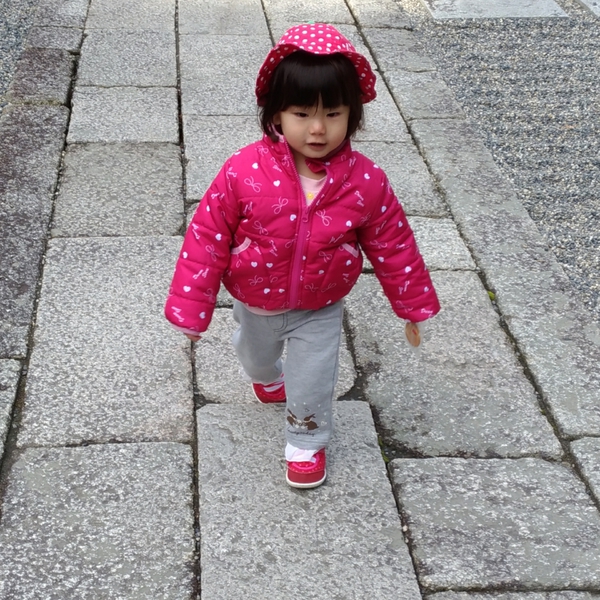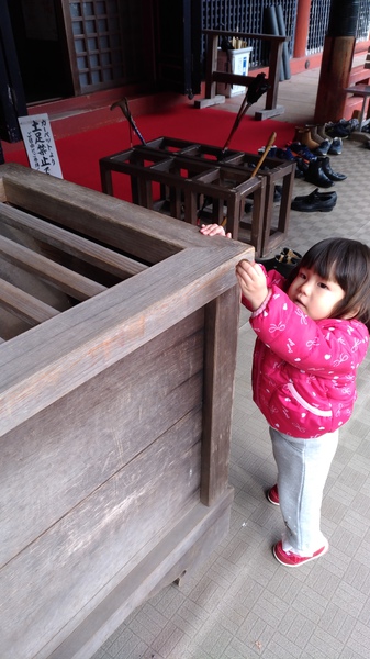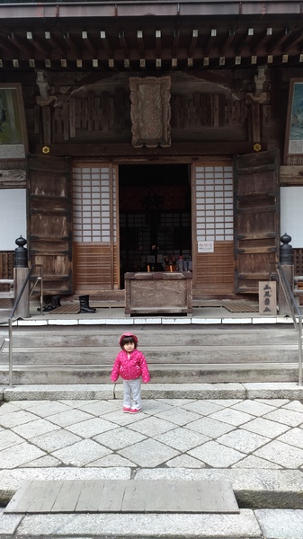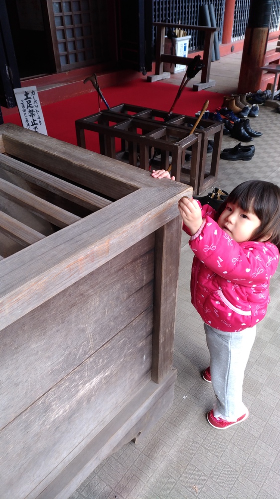 御朱印もらったらお寺の方が小さな子供さんへとお菓子を1つもらい手に持ってごきげんさんのなっちゃん。