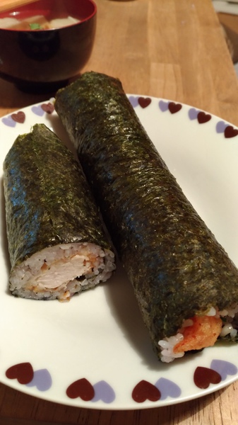 海老天巻きと鶏天巻き作って、なっちゃんは鶏天巻きのハーフサイズ。